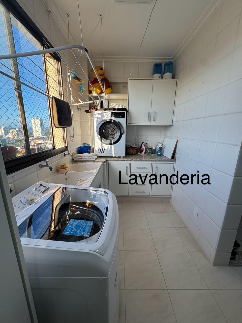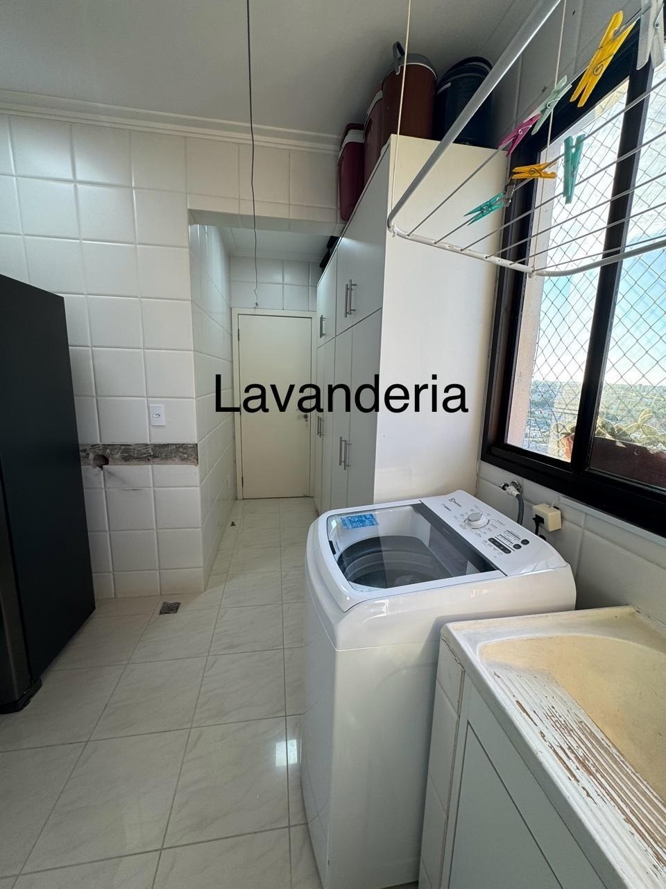 - Lavanderia com armários planejados e tela de proteção na janela;