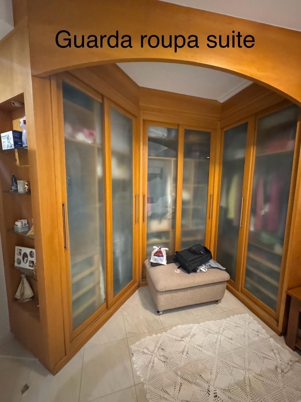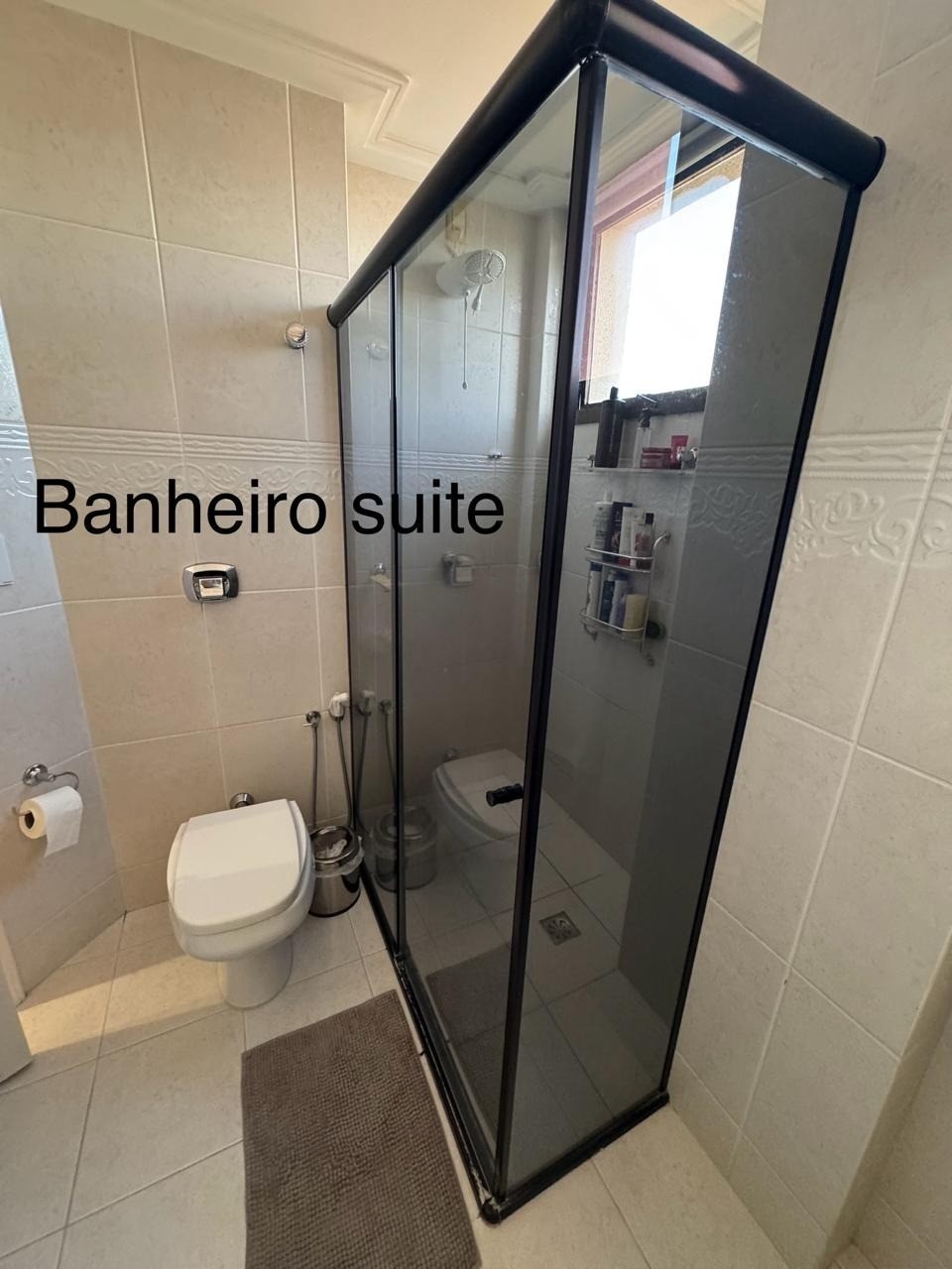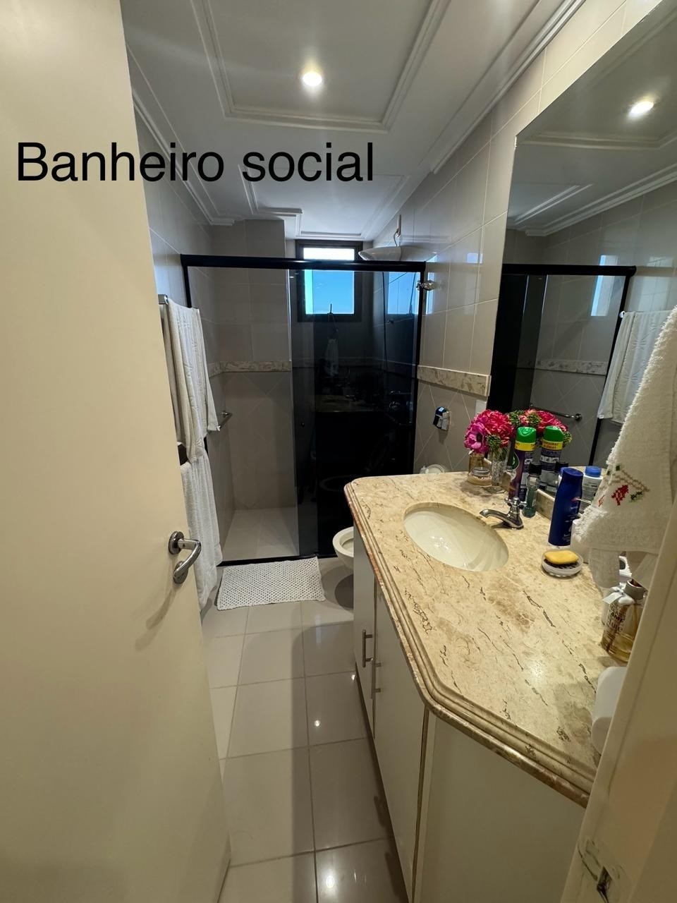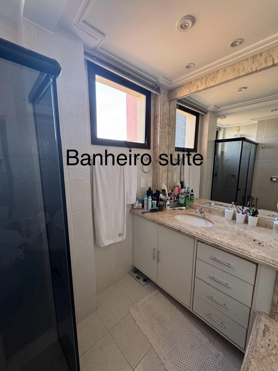 - Banheiro da suíte grande espaçoso com bancada em mármore e armários planejados, box blindex vidro fumê;