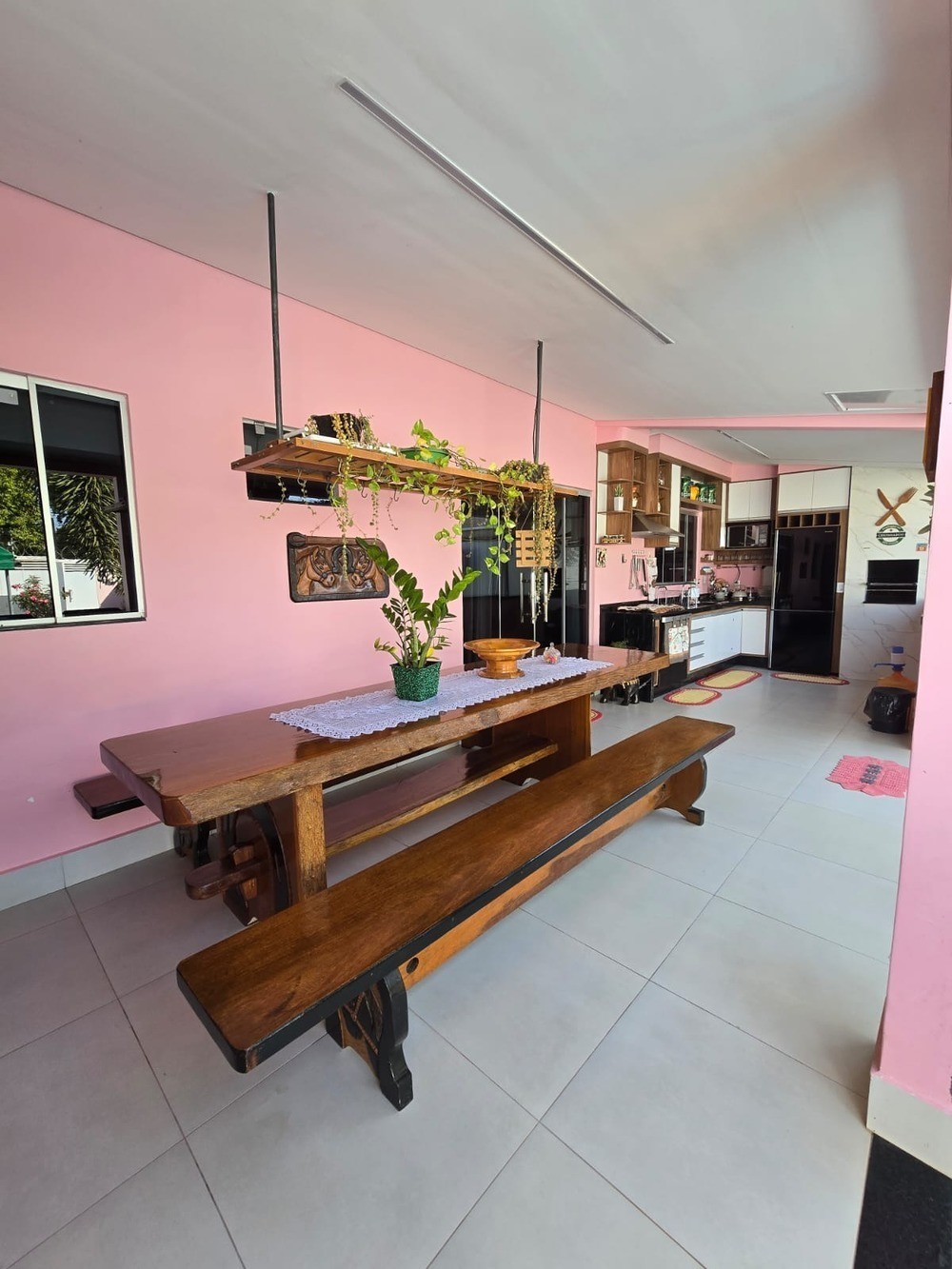 - Cozinha completa de utensílios domésticos, desde pratos, talheres, copos, taças, panelas, airfryear, batedeira, liquidificador, lancheira, grelha, espetos, tabuas, um jogo de panelas fondue carrossel giratório, mesa na área para 16 assentos ao todo. Mais uma mesa no quintal para 5 assentos;