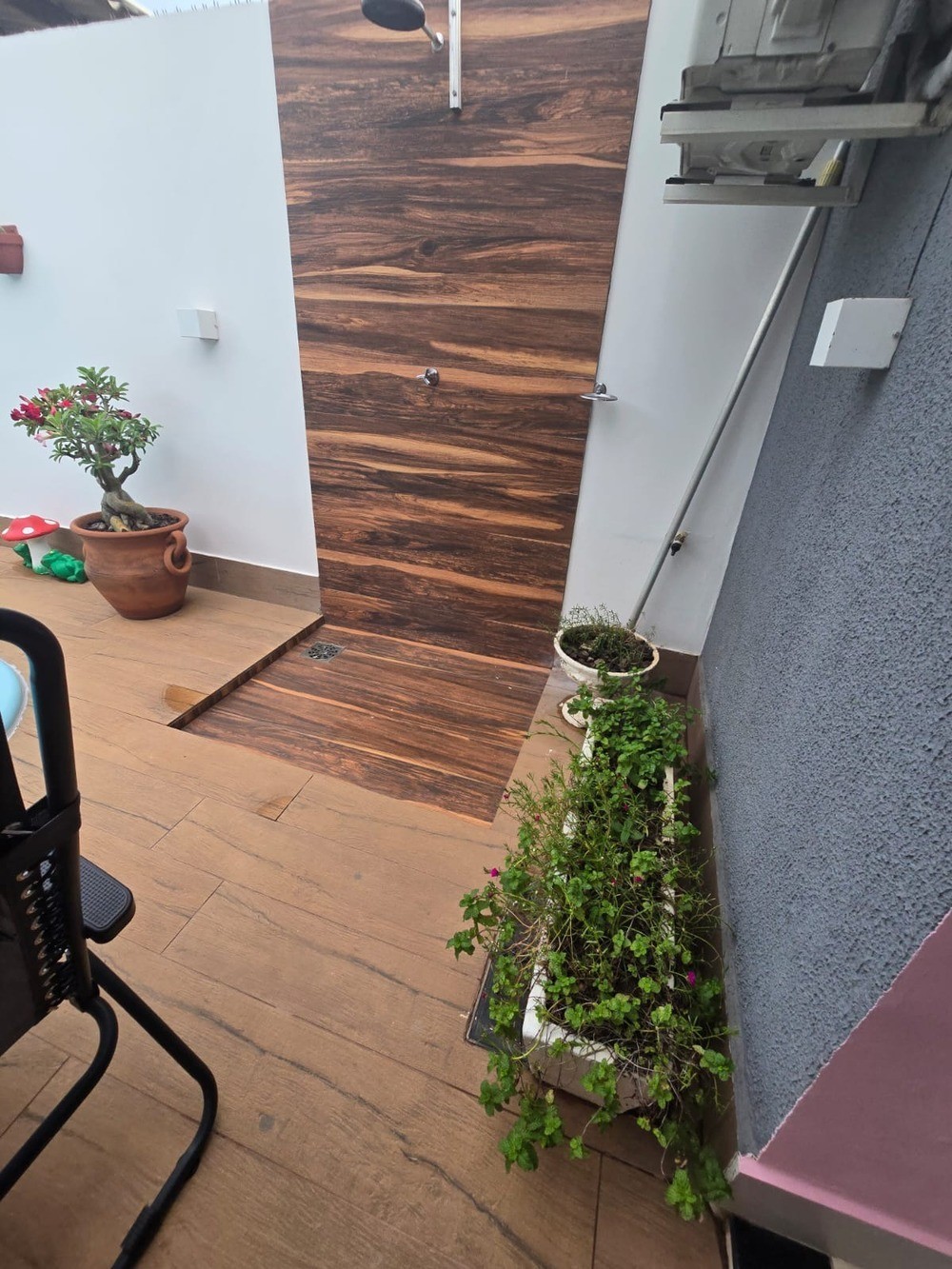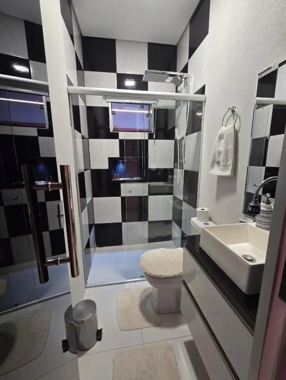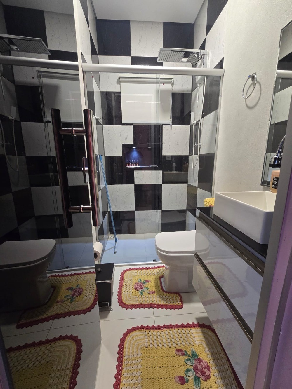 - Banheiro com armário, box, espelho, chuveiro;