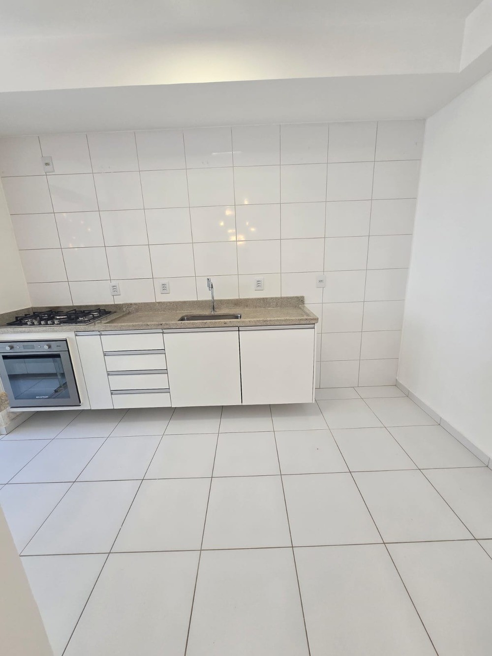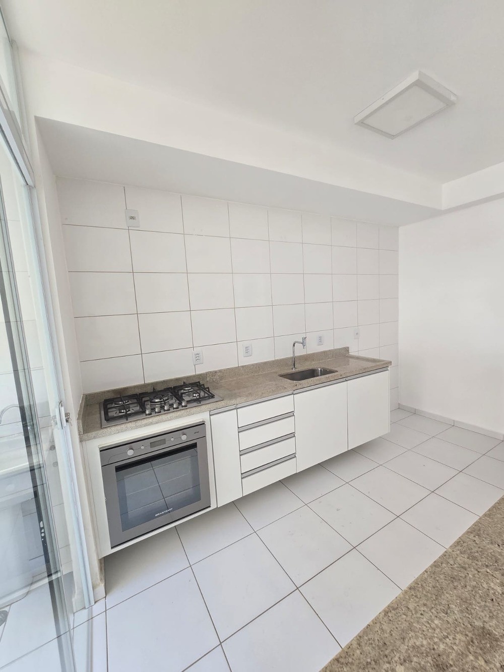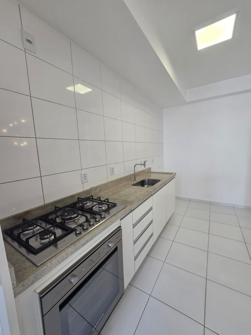 - Cozinha com bancada em mármore armário, cooktop, forno e armário;
