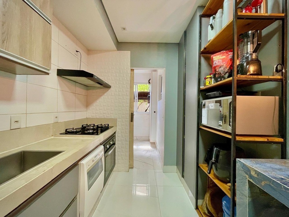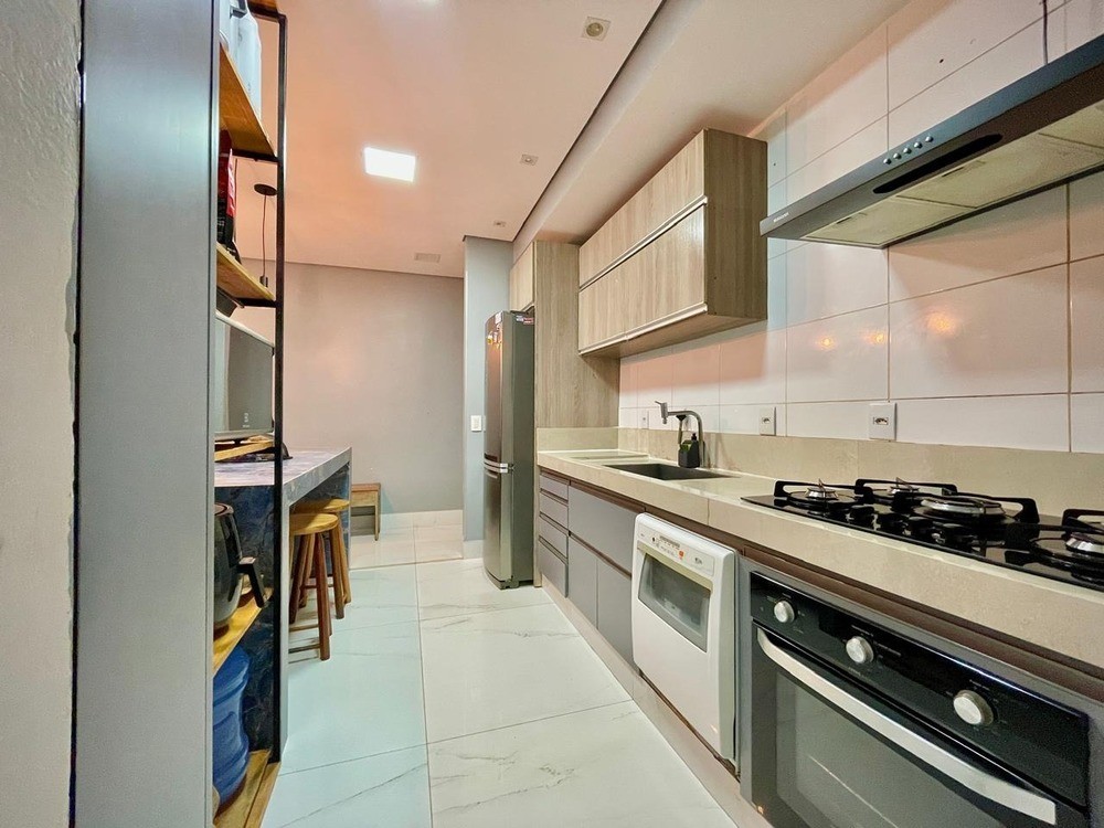 - Cozinha com bancada, armários planejados, coifa, cooktop e forno;