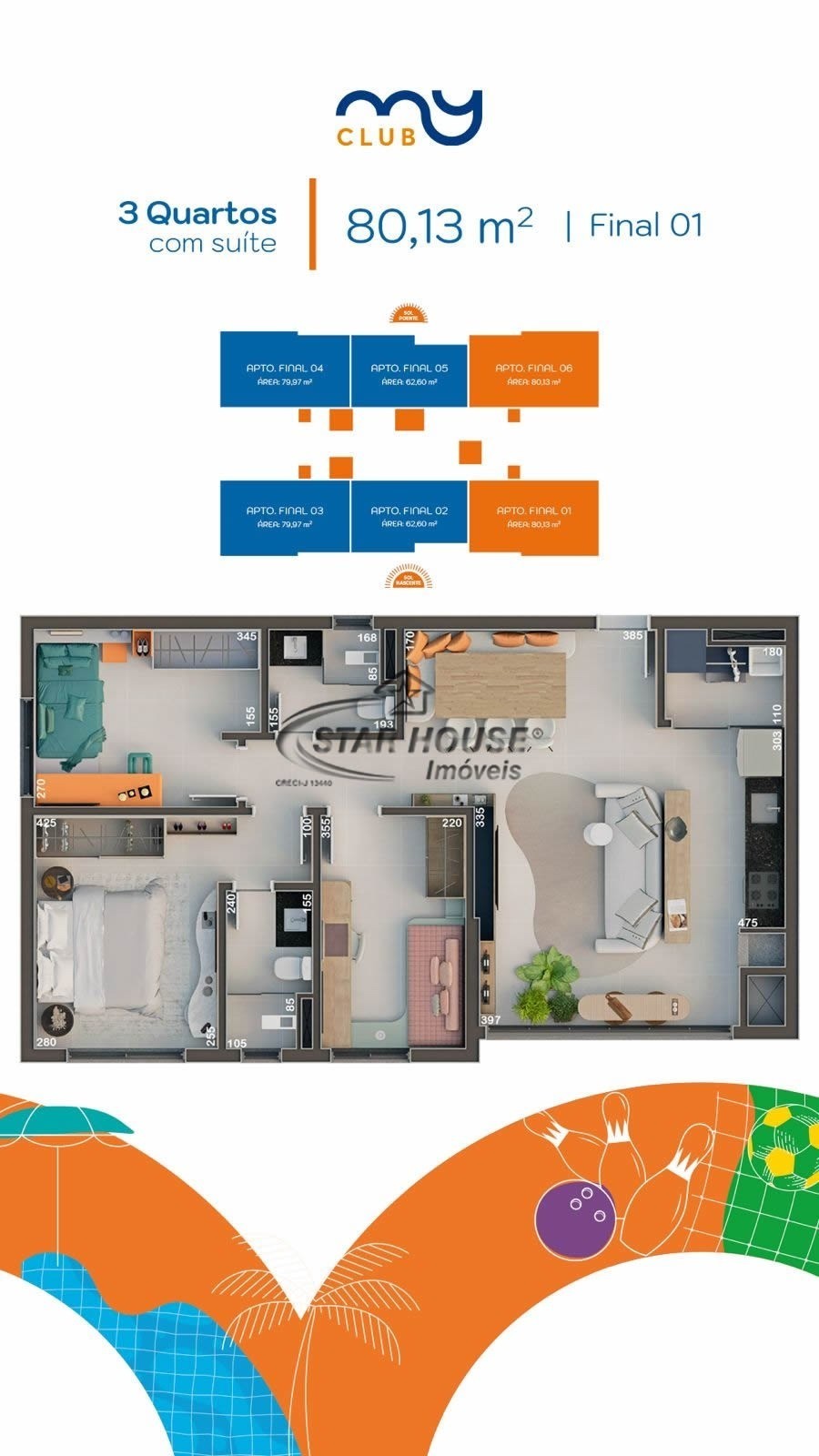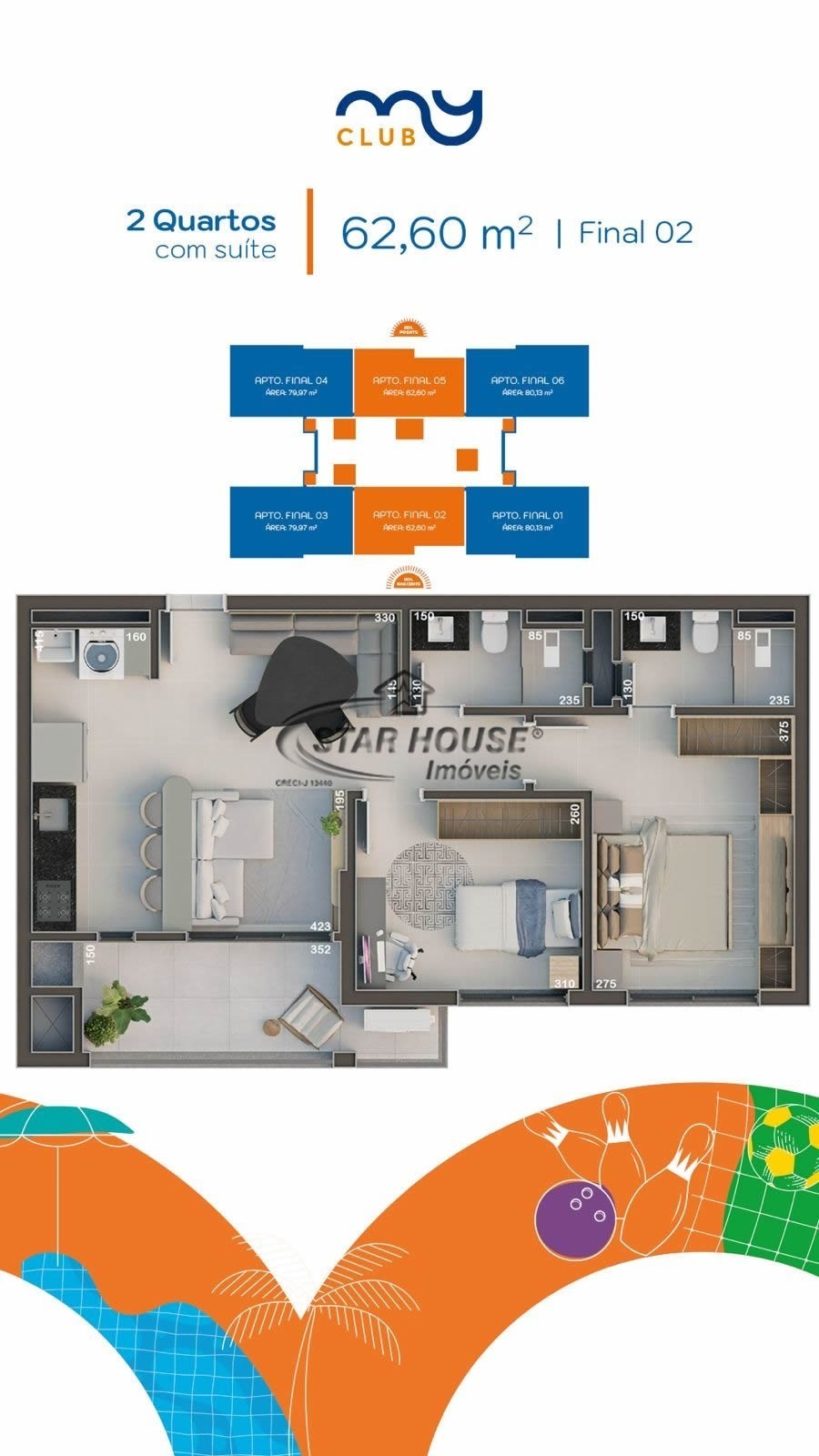 - Apartamentos 2 e 3 quartos — 63m² e 80m²;